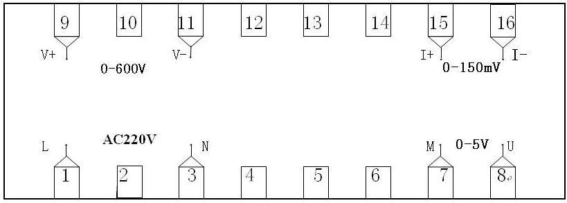 其中1,3接進線電源AC220V,儀表端子7點接G5系列電源的M點,儀表端子8點接G5系列電源的U點,9、11接G5系列電源的V+,V-點,15、16接G5系列電源的I+、I-點。